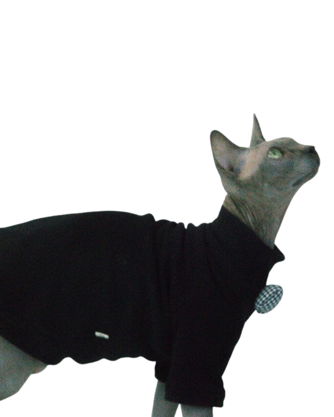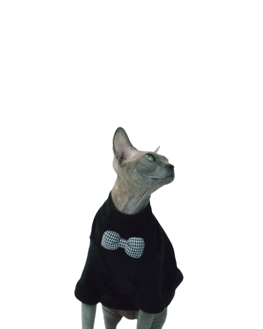 Give your feline a sophisticated look with this stylish black T-shirt featuring a cute checkered bowtie design. Perfect for special occasions or casual outings, this comfortable shirt adds a touch of elegance to your cat’s wardrobe. Ideal for hairless cats or any pet who enjoys a fashionable, cozy fit.