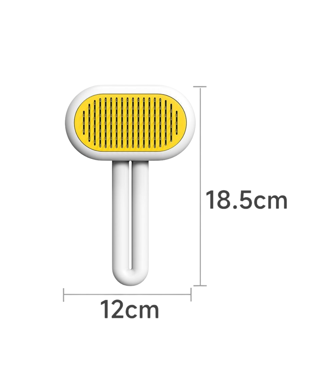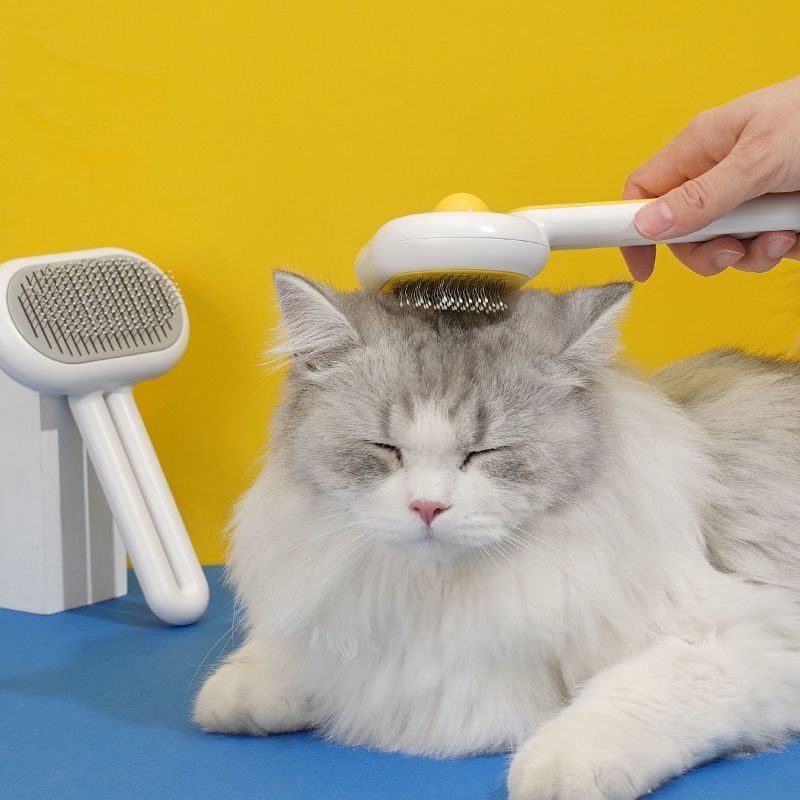 This is a pet grooming tool designed to clean and brush your pet’s fur. It combines the functionality of a comb and a brush in one device, providing comfort and care for your cat’s coat. The tool has a soft, yellow grooming head with fine, spaced bristles that help remove loose fur and tangles, making it especially useful for long-haired cats. The handle is ergonomically designed to be easy to hold, making grooming sessions pleasant for both you and your pet. The pet seems to enjoy the relaxing sensation as it’s being brushed, creating a calming grooming experience for your furry friend!