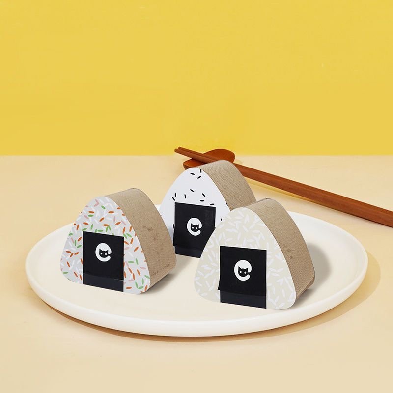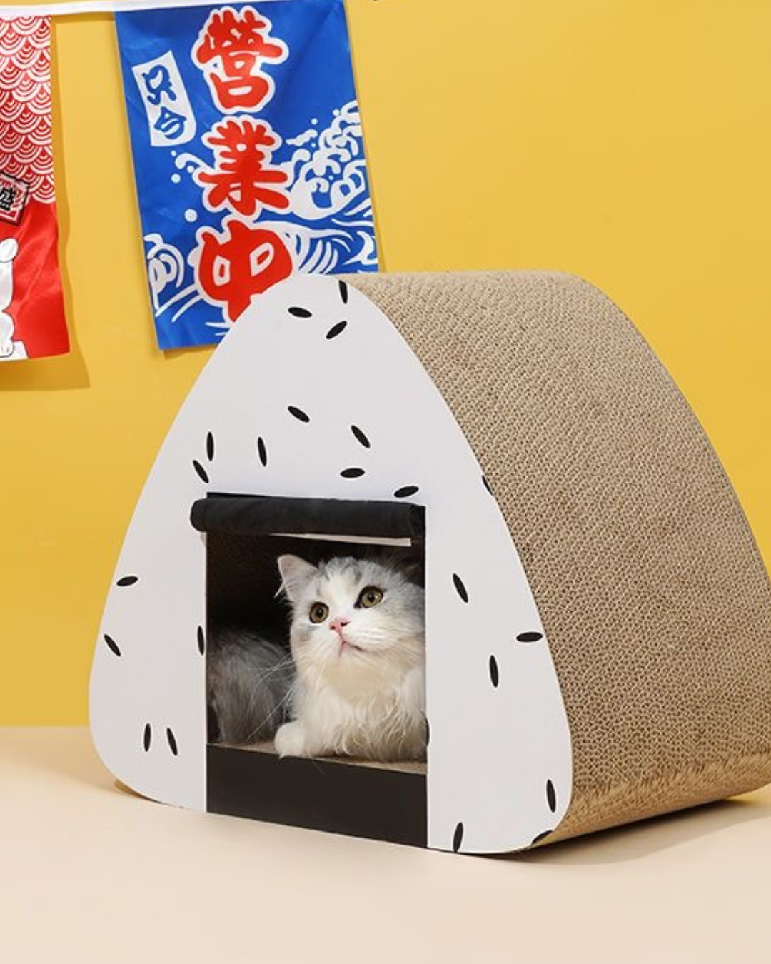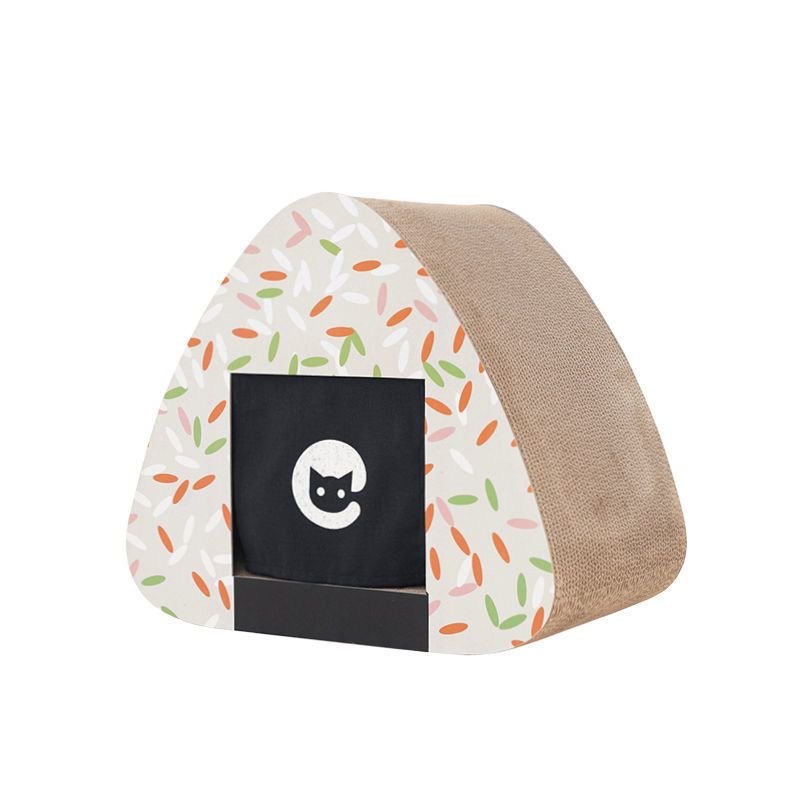 This is a cat scratching house designed to resemble an onigiri (Japanese rice ball). It has a triangular shape with a textured, scratchable surface made of durable cardboard, perfect for cats to scratch and sharpen their claws. The exterior is decorated with black and colored designs that mimic the look of rice grains, adding a playful and cute aesthetic to the piece. The front features a small black opening, allowing your cat to enter and use it as a cozy hideout or resting spot. This multi-functional piece serves as both a scratching post and a comfortable hideaway for your cat, offering a fun and practical addition to any home.
