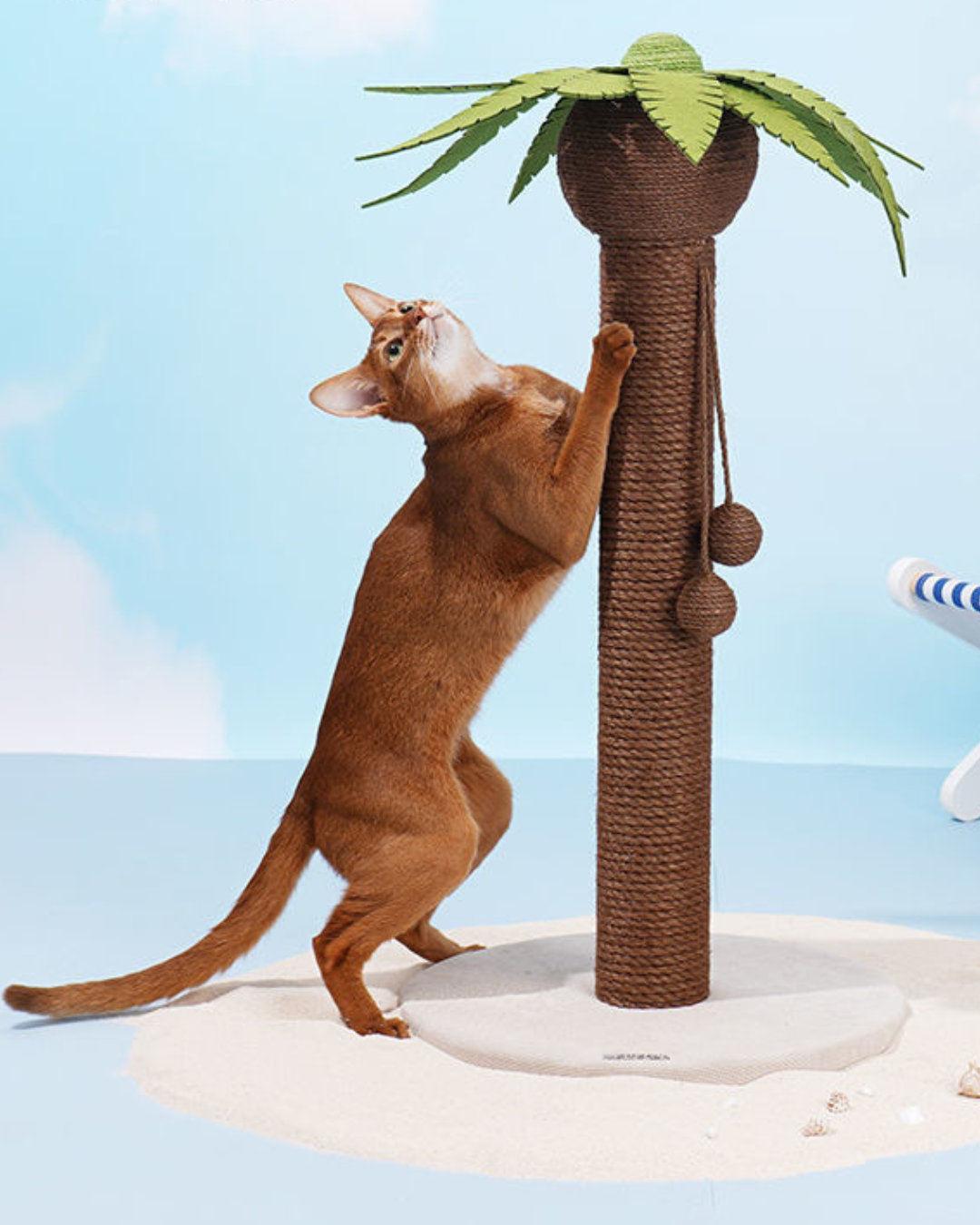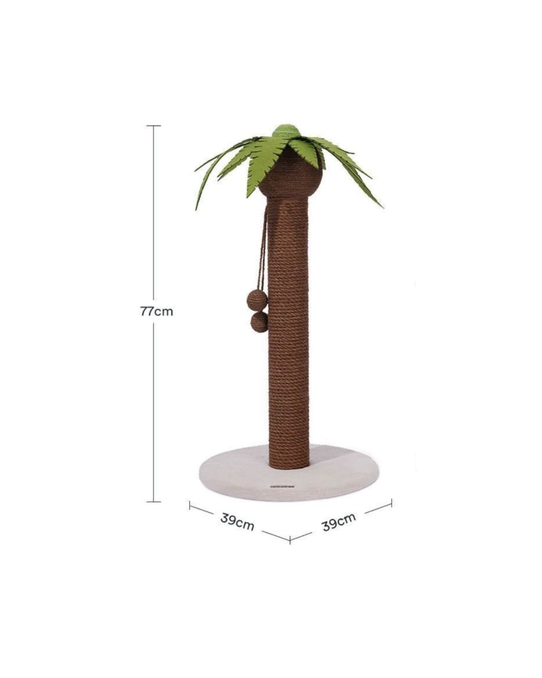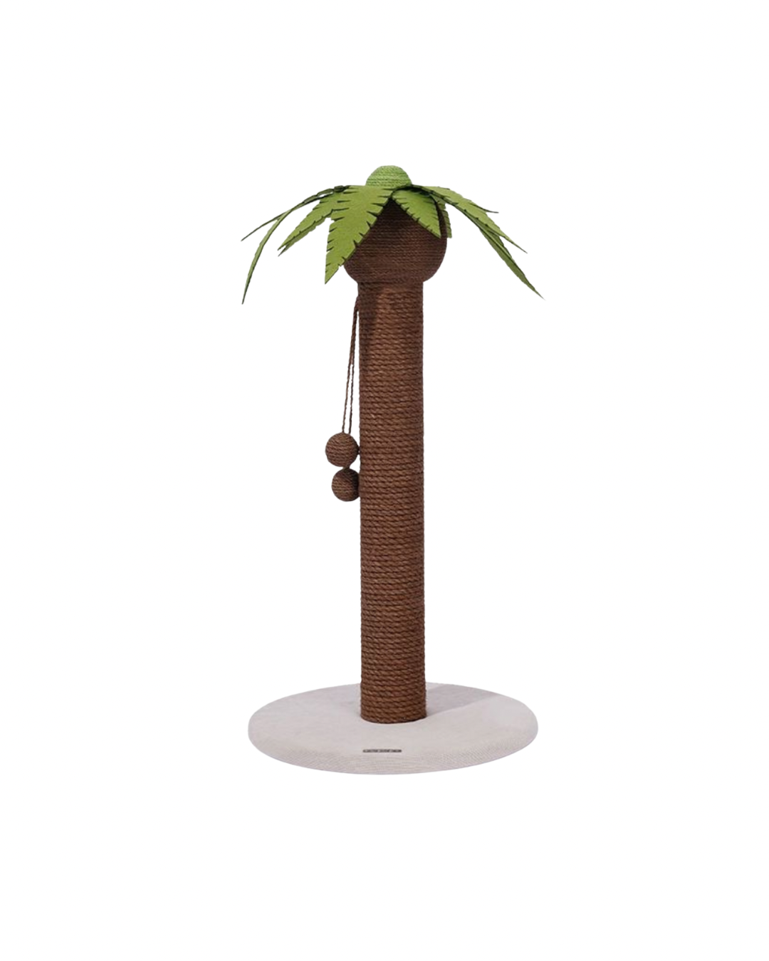 This cat scratching post is designed in the shape of a playful palm tree, offering both functionality and fun for your cat. The post is covered in durable rope material, providing a perfect surface for your cat to scratch and stretch, helping to keep its claws healthy. At the top, the palm tree features large, green felt leaves, adding a tropical vibe to your home. Hanging from the post are two pom-pom-like toys that dangle, offering extra entertainment and encouraging your cat to bat and chase. The base is made from a soft, non-slip fabric, providing stability and ensuring the post remains secure as your cat climbs and scratches. This multi-functional design serves as both a scratching post and a play structure, giving your cat a playful, engaging environment while also protecting your furniture from damage.